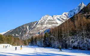 Sentier piéton damé au départ de la Maison nordique de Chamonix. En fond de vallée un itinéraire facile vous emmène entre forêt enneigée et vue spectaculaire sur les Drus.