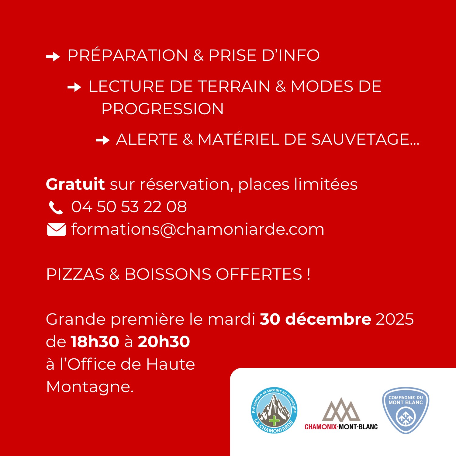 Gratuit sur réservation (places limitées) au 04 50 53 22 08 ou formations@chamoniarde.com.