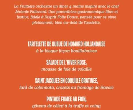 Jeudi 5 février, La Fruitière accueille Jérémie Falissard pour un dîner à quatre mains, pensé comme un moment à partager.