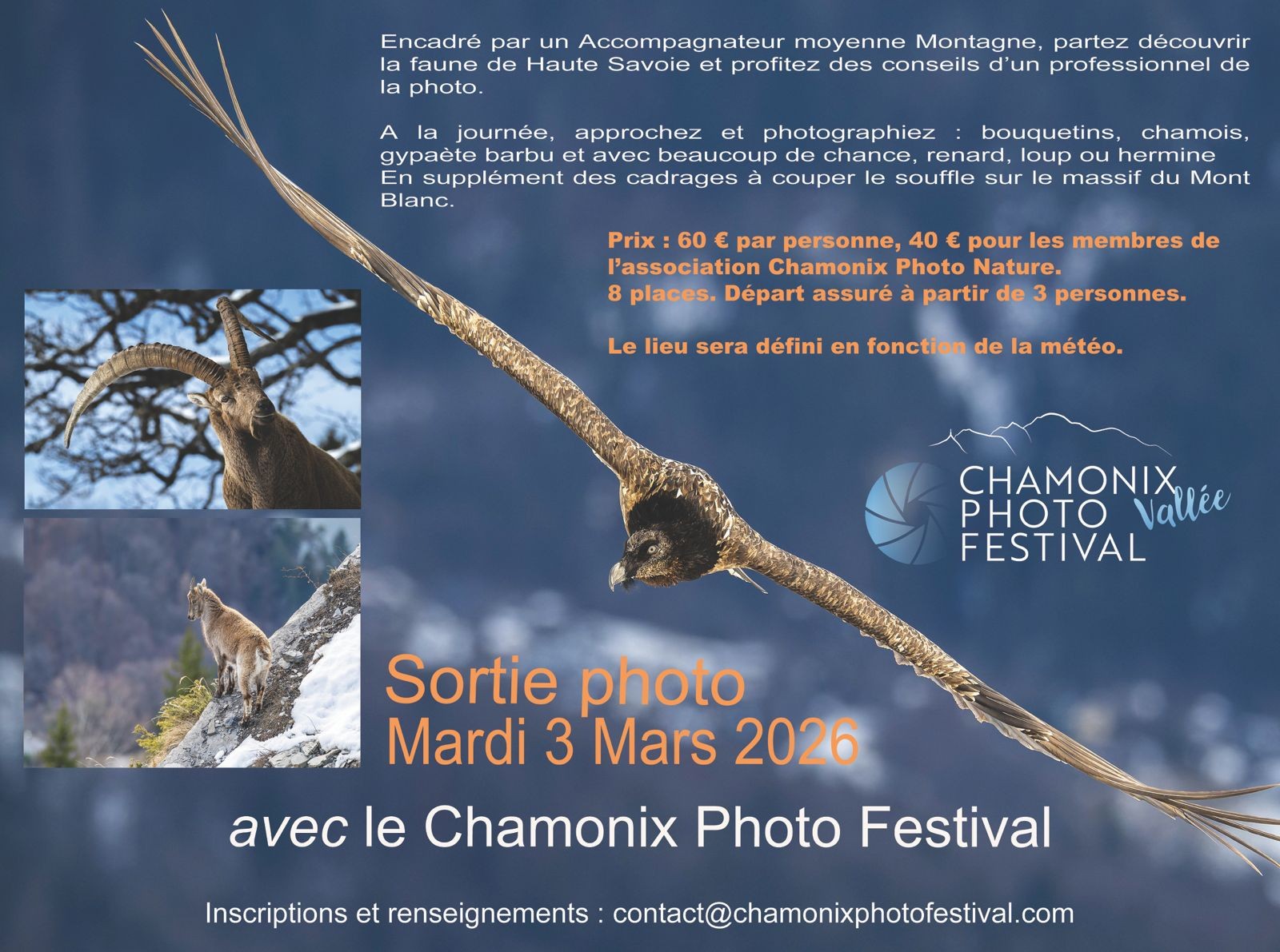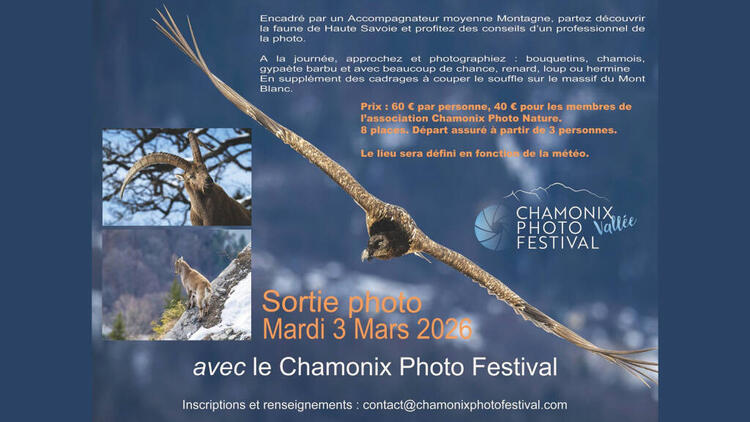 Le Chamonix Photo Festival organise une sortie photo à la journée encadrée par un accompagnateur moyenne montagne. Le lieu sera défini en fonction de la météo.