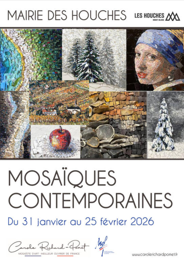 La mairie des Houches accueille une exposition de mosaïques contemporaines de Carole Richard-Pomet, Artiste Mosaïste – Meilleur Ouvrier de France. Entre éclats de matière et jeux de lumière, ses œuvres invitent à la contemplation et au voyage sensible.
