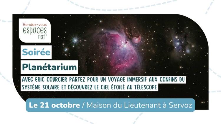 Franchissez la porte du planétarium et embarquez pour un voyage immersif jusqu’aux confins du système solaire. Si le ciel est clair, la soirée se poursuivra à l’extérieur, avec une observation du ciel au télescope.