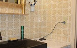 Salle de bains avec baignoire et lave-linge. Toilettes séparées.
