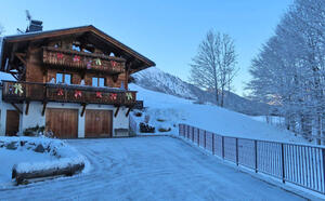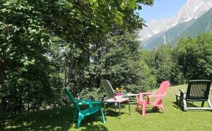 Chalet individuel de 85m2 aménagé sur 2 niveaux (au 1er et 2ème étage), face au massif du Mont-Blanc, et surplombant le village des Houches. Le chalet est situé au bout d'une impasse, à côté de la maison des propriétaires (qui comprend un autre gîte). Deux garages propriétaires sont présents au rez-de-chaussée du chalet.